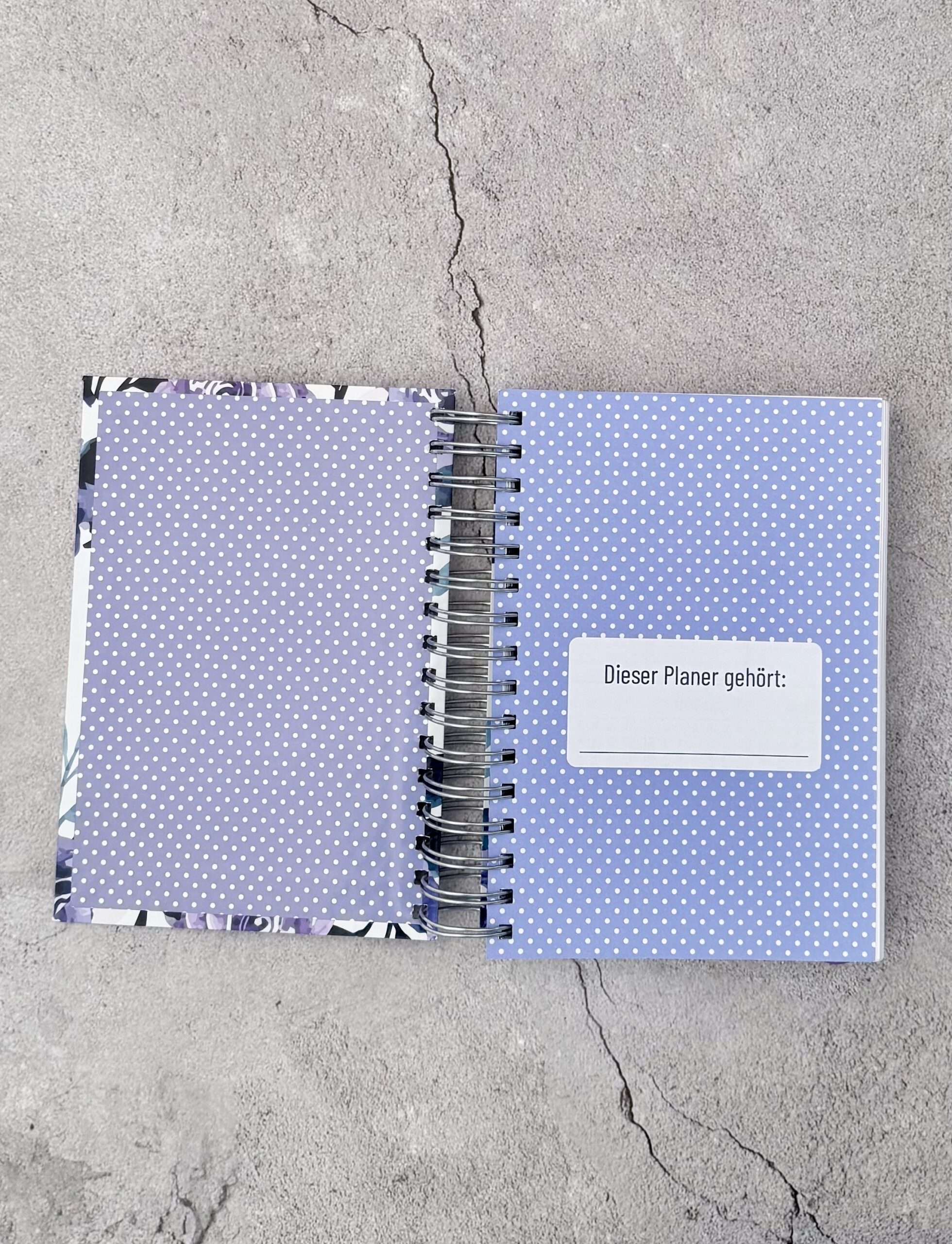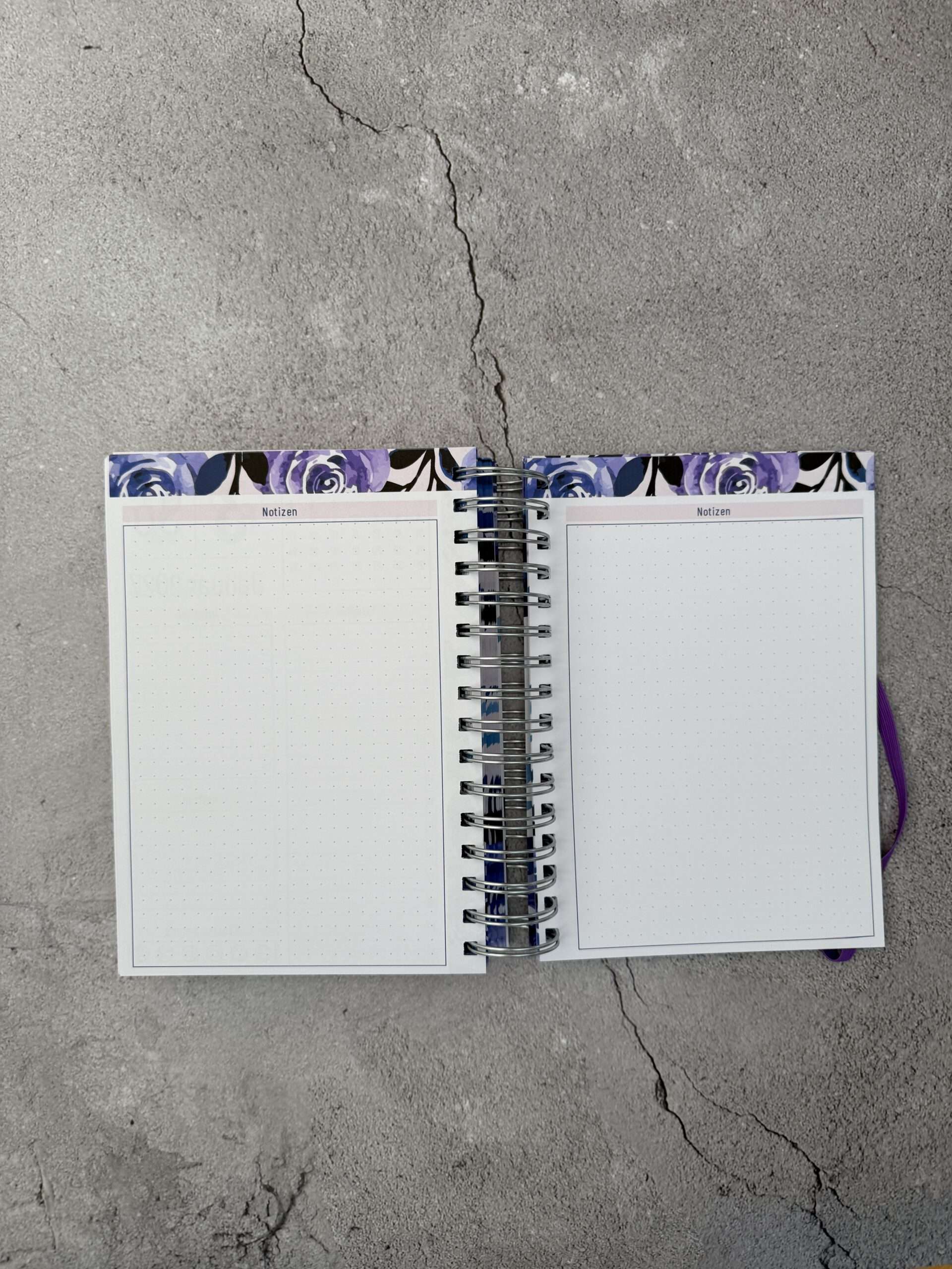 Die Buchdeckel sind aus 1,5mm starker Buchbinderpappe gefertigt und mit Stickerpapier überzogen. Gebunden ist das Buch mittels einer robusten Drahtkammbindung, so dass jede Seite vollständig umgeschlagen werden kann. Ein Gummiband hält den Kalender bei Nichtgebrauch geschlossen.