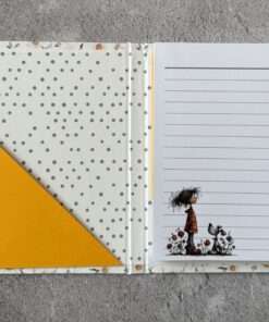 Die Buchdeckel sind aus 1,5mm starker Buchbinderpappe gefertigt und mit Stickerpapier überzogen. Ein farblich passendes Gummiband hält den Einband bei Nichtgebrauch geschlossen.